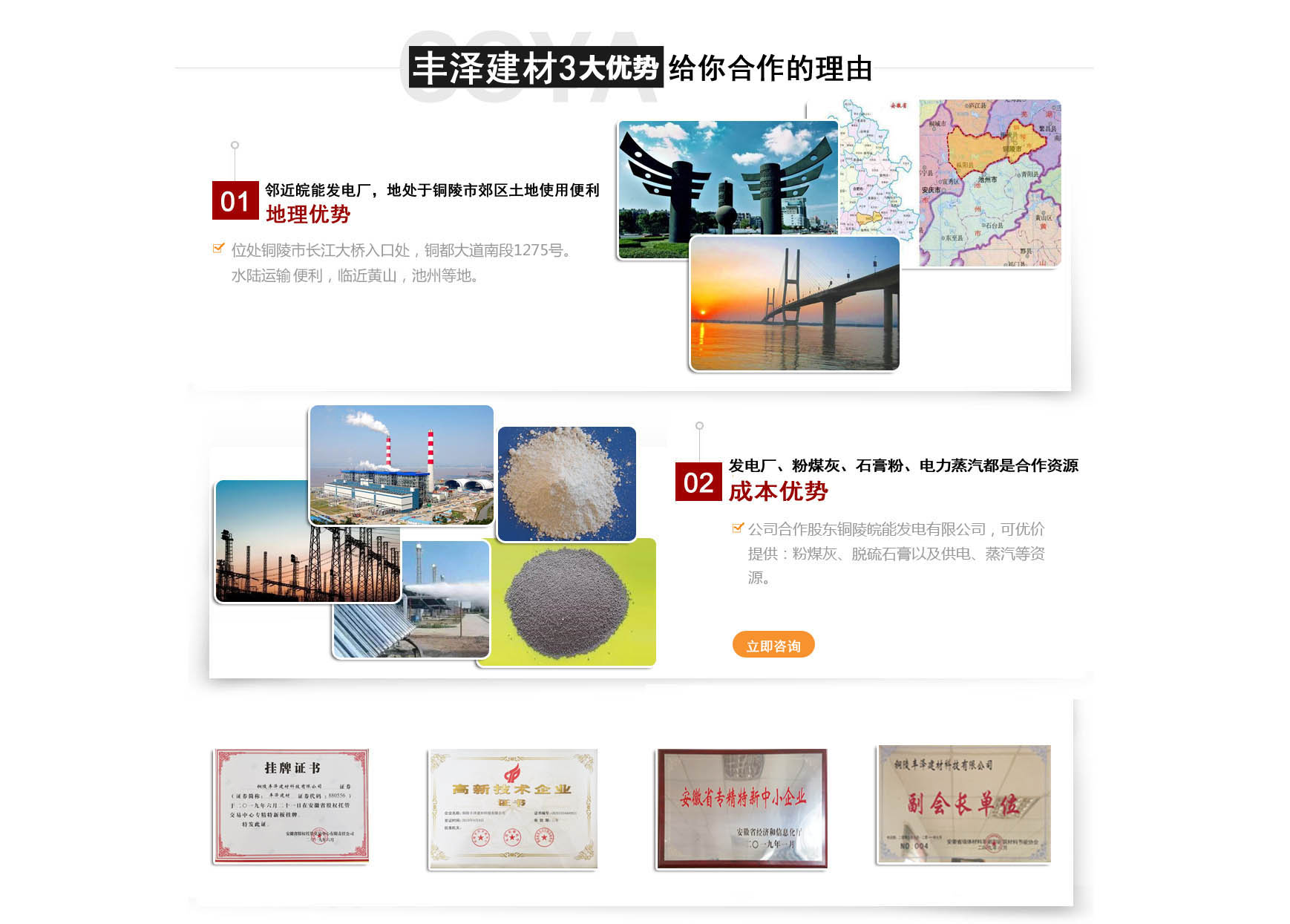 銅陵豐澤建材科技有限公司成立于2007年2月,坐落于銅都大道南段,占地4萬平方米,公司注冊資金1000萬元,現有職工百余人,是一家與皖能發(fā)電公司合作,專業從事電廠粉煤灰開發(fā)利用的高新科技企業,現擁有一條年產30萬立方米蒸壓加氣混凝土全自動生產線。 蒸壓加氣混領土(英文名Autoclaved aerated comcrete),也稱AAC,是以砂、粉煤灰等硅質材料和石灰、水泥等鈣質材料為主要原料,摻加鋁粉為發(fā)氣劑,進行生產的新型墻體材料。是我國推廣應用最早,使用最廣泛,技術最完整的輕質保溫墻體材料之一,自問世以來,始終方興未艾,備受推崇。